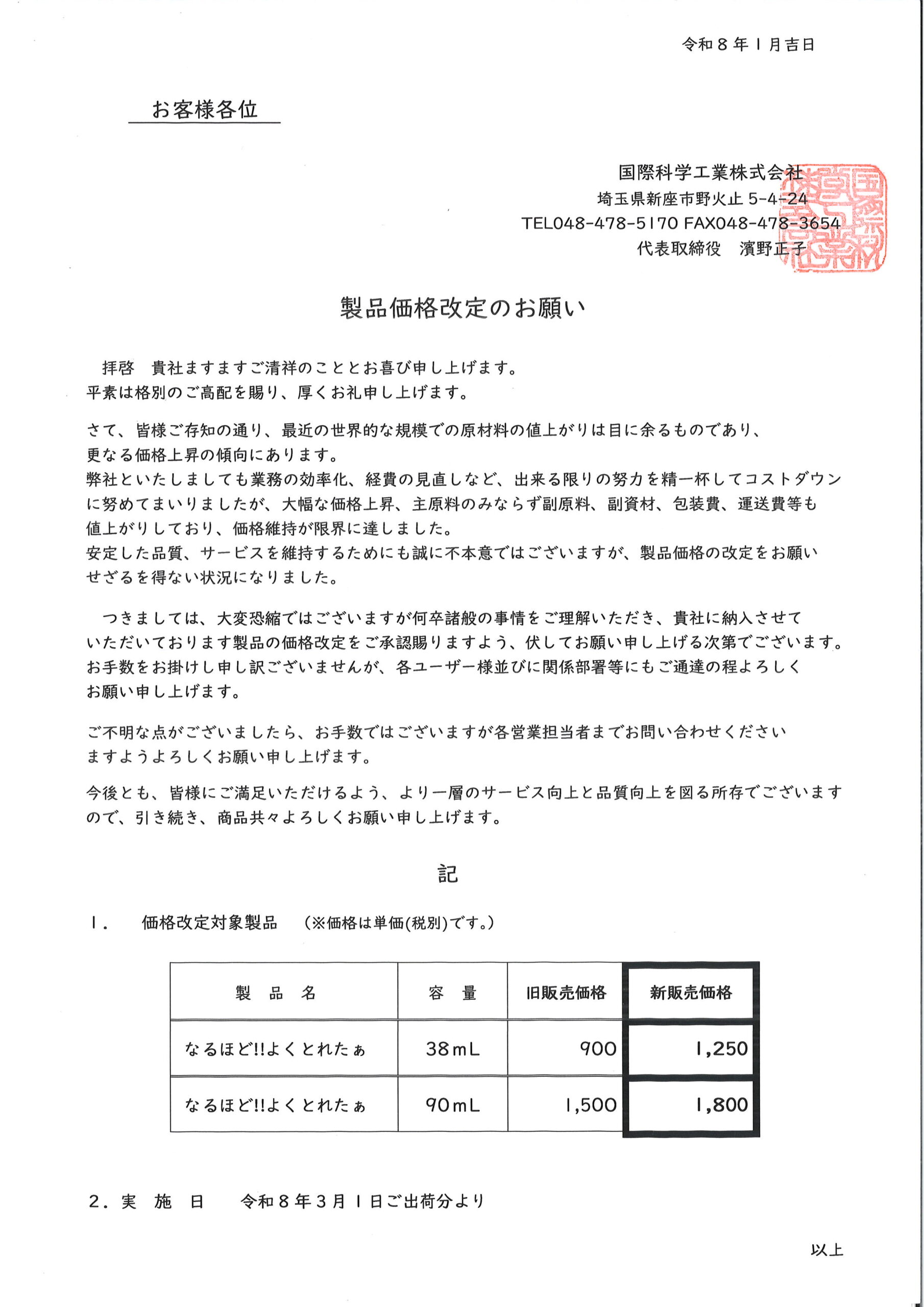 ラベル剥離剤「なるほど!!よくとれたぁ」製品価格改定のお知らせ